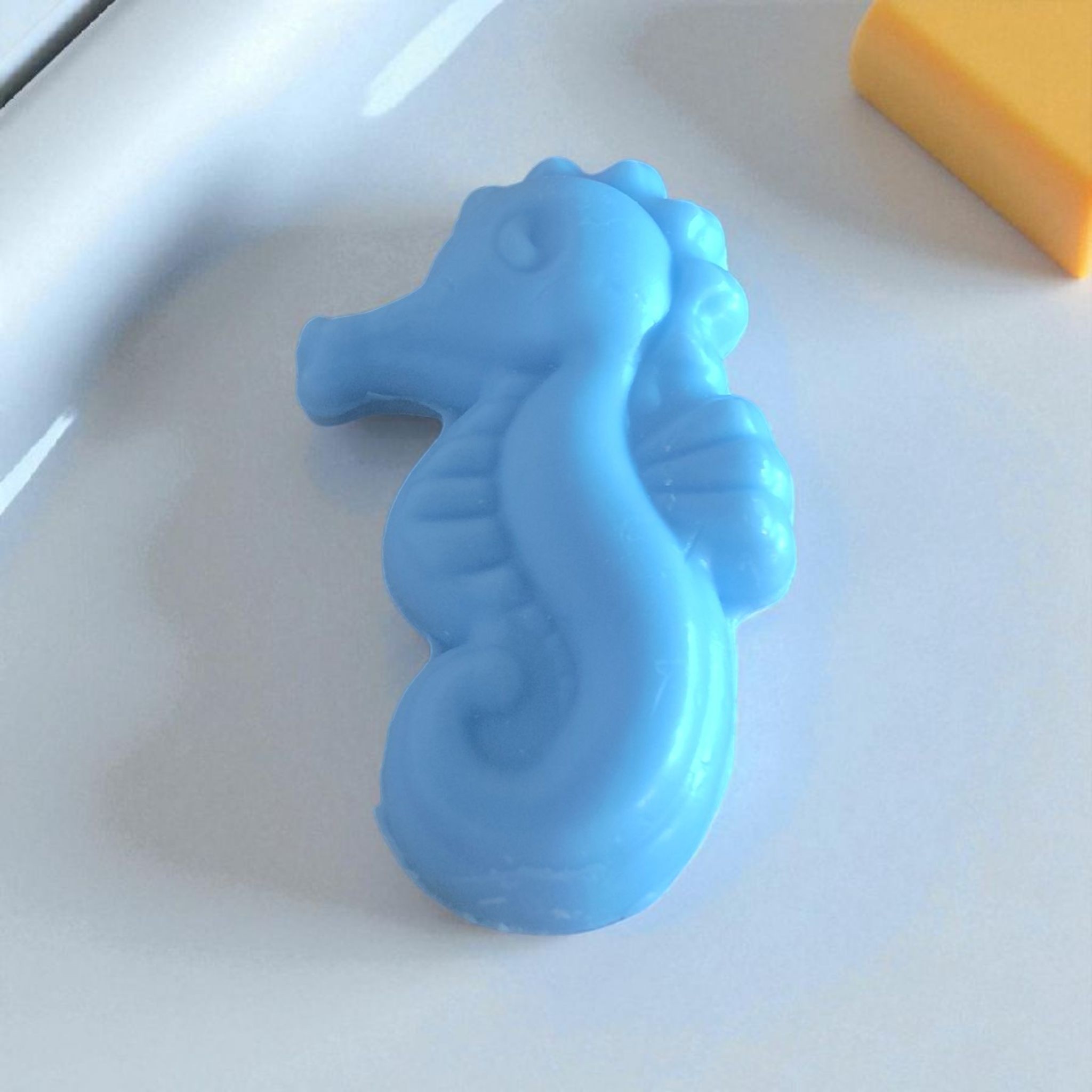 Savon fantaisie de couleur bleue en forme d’hippocampe parfum fraîcheur écume 40 gr.