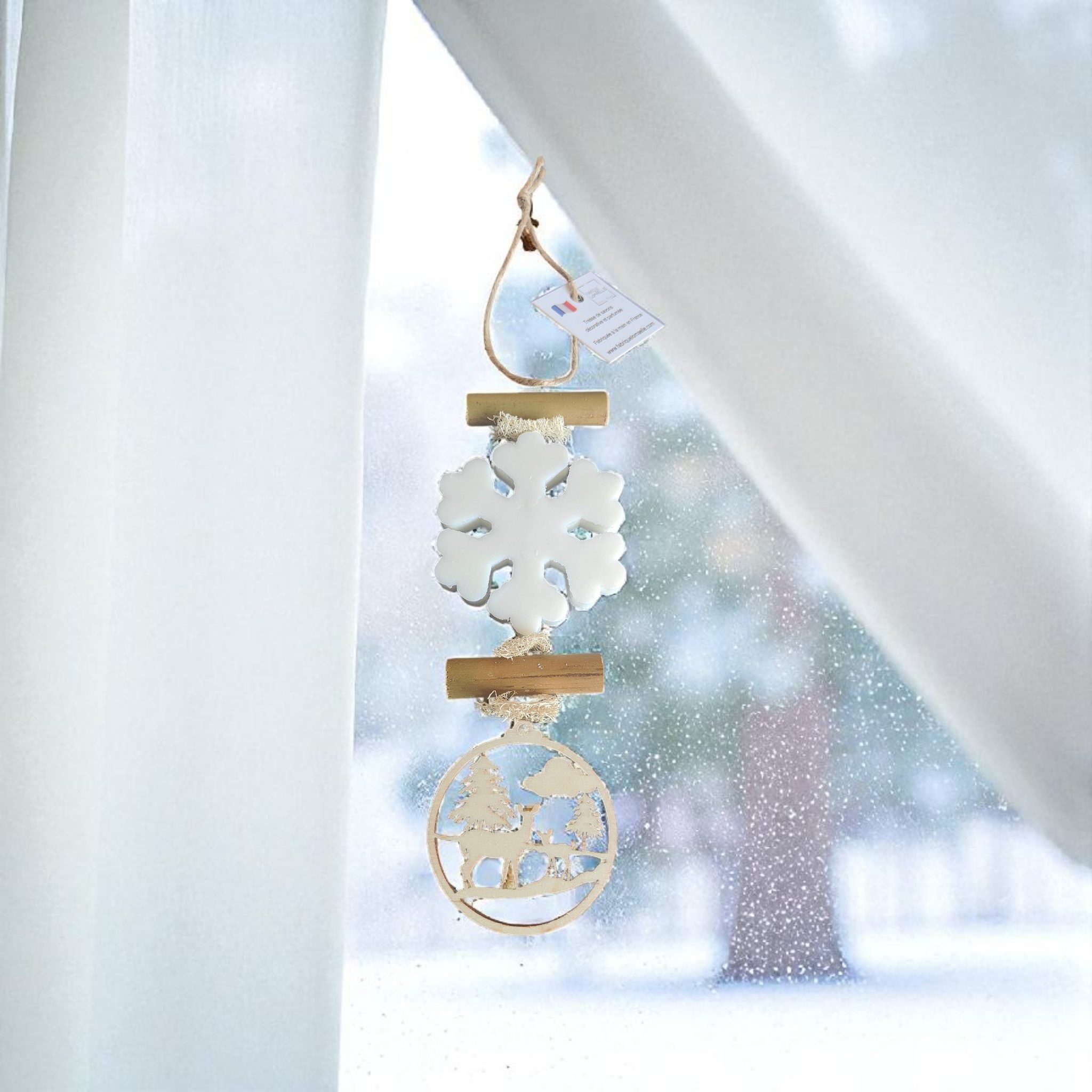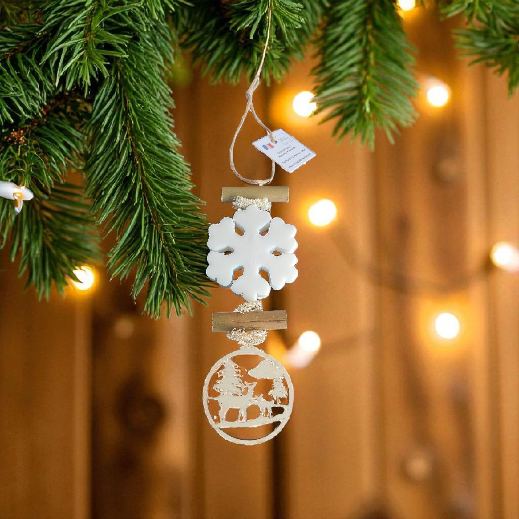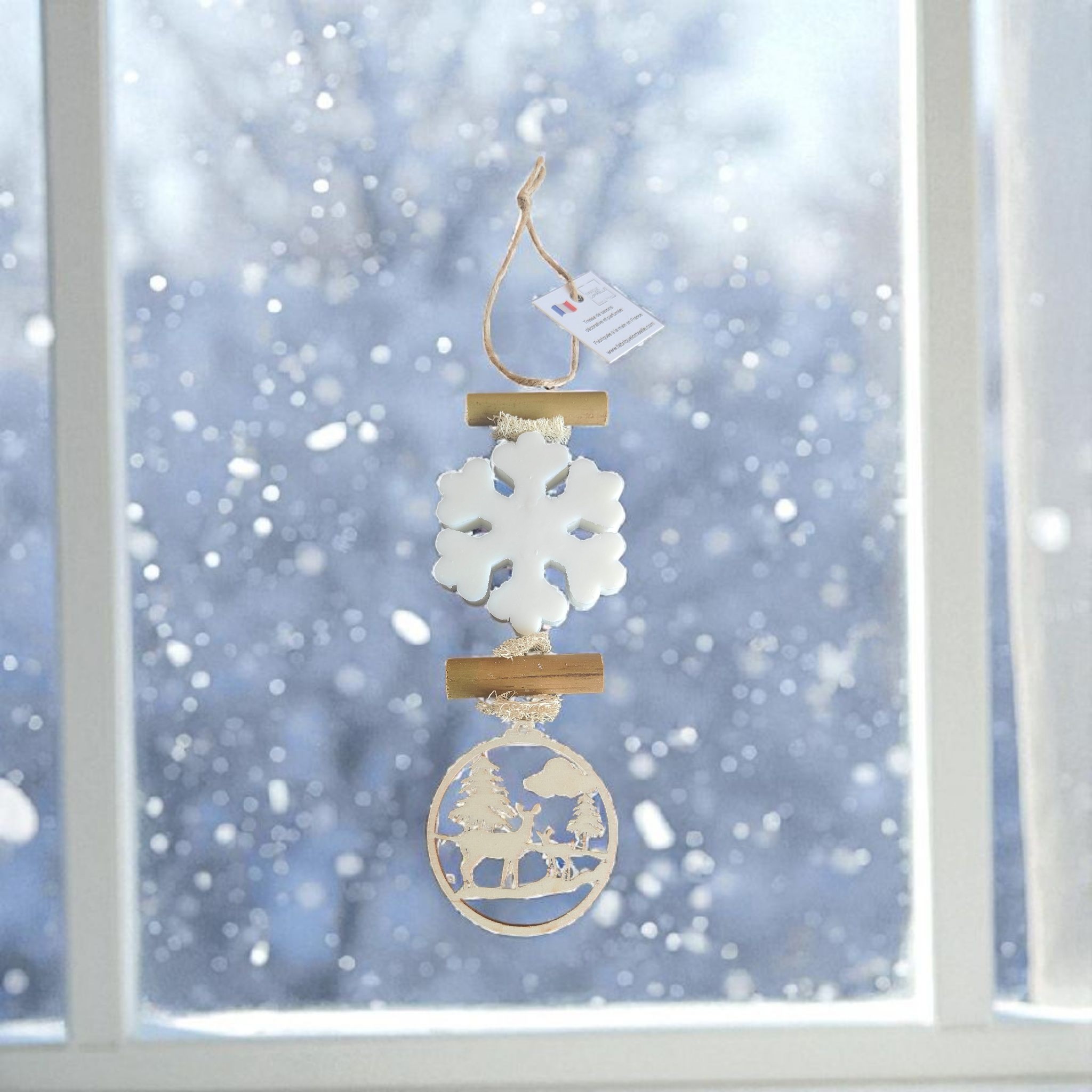 Savon parfumé en forme de flocon de neige blanc parfumé bergamote avec un rond en bois découpé au laser .